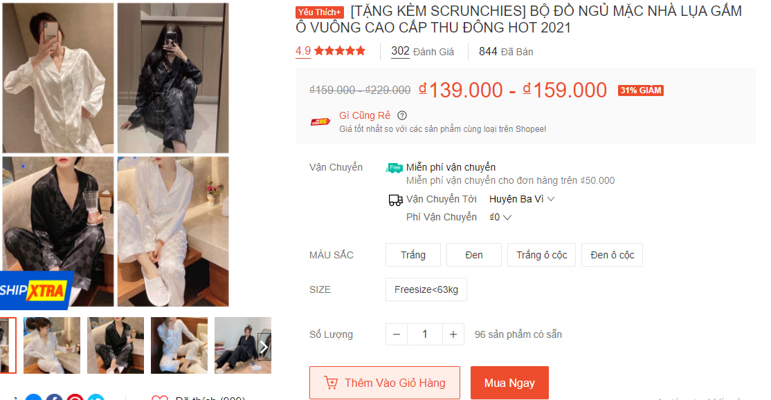 Được kinh doanh bởi shop Thuyvuuu - một shop lọt top Shop yêu thích trên Shopee với gần 30k lượt theo dõi. Các sản phẩm mà shop bán ra đều đi kèm với chất lượng và sự hài lòng đến từ khách hàng. Bộ ngủ lụa gấm cao cấp có 4 màu chủ đạo đó là Trắng, Đen, Trắng ô cộc, Đen ô cộc. Sản phẩm phù hợp với những bạn từ 63kg trở xuống. Đặc biệt, shop đang có ưu đãi mua bộ ngủ được tặng thêm cả Scrunchies nữa đó, các chị em nhanh tay chớp Deal khủng này nha.