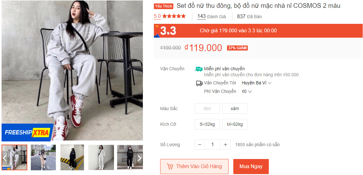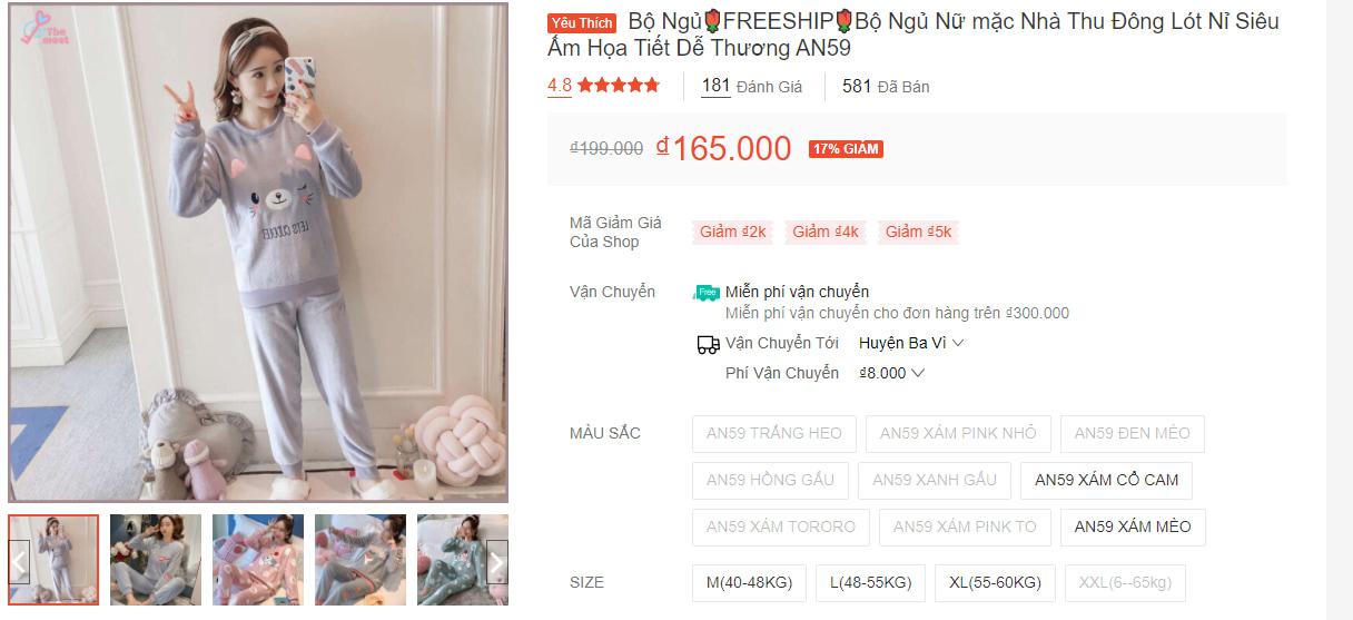 - BƯỚC 2: Sau khi đã chọn được bộ đồ nữ mặc nhà ưng ý, bạn nhấn thêm vào giỏ hàng.