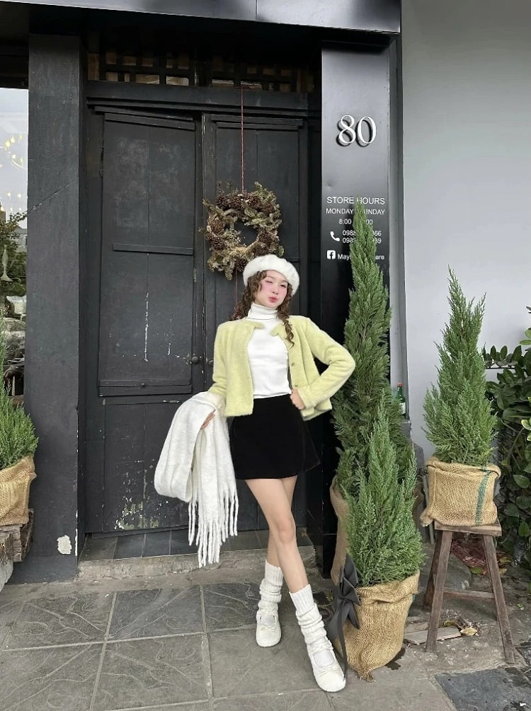 - Áo len dáng ôm hoặc oversize – Mùa lạnh, bạn có thể mix cùng chân váy thô, chân váy nhung hoặc chân váy nỉ để giữ ấm mà vẫn sành điệu.