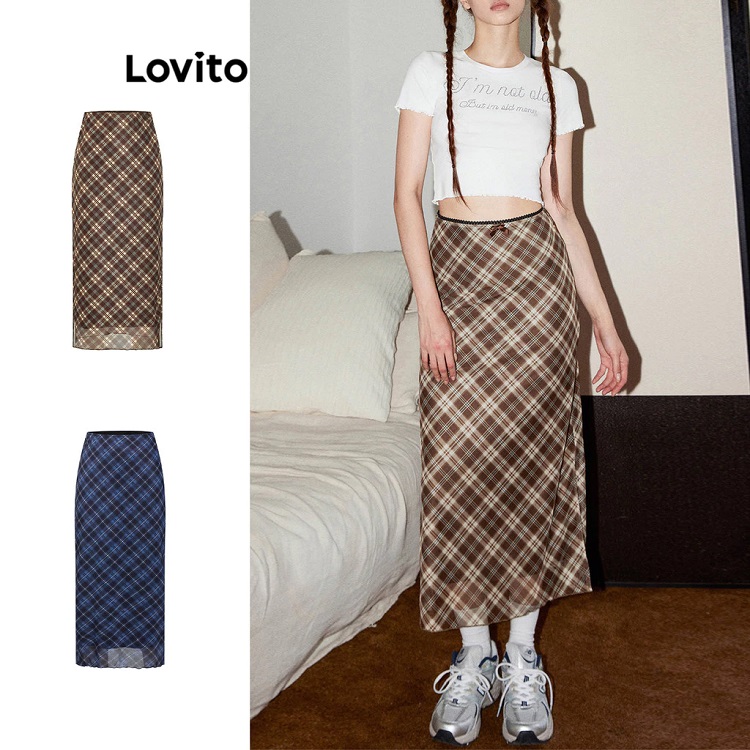 - Chân váy xòe Lovito 2 lớp họa tiết kẻ sọc phong cách preppy