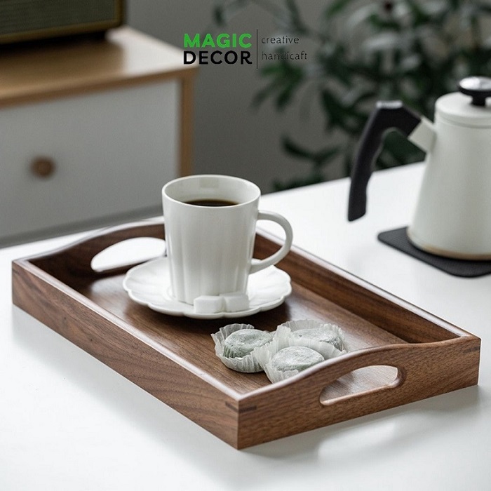 Khay trà được làm từ chất liệu gỗ óc chó, gỗ tần bì tự nhiên, cao cấp. Khay đều là gỗ tự nhiên nên rất dễ decor, bày đồ ăn và phong cách sang trọng. Sản phẩm có tính thẩm mỹ cao, thân thiện với môi trường, dễ dàng vệ sinh tẩy rửa. Bên cạnh đó, sản phẩm đã hoàn thiện qua xử lý chống ẩm mốc, chống mọt và được nhiều nhà hàng hay quán cafe lựa chọn để đựng đồ.