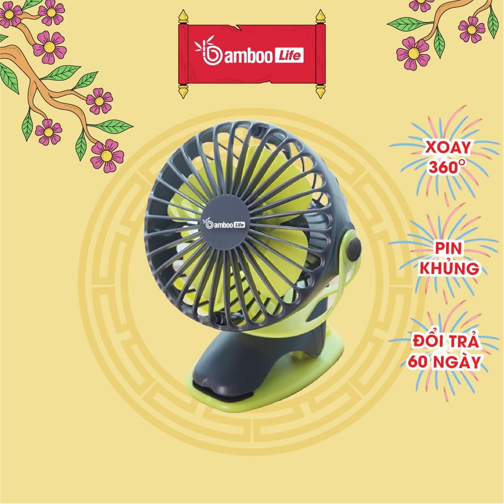 Quạt mini tích điện Bamboo Life để bàn tiện lợi, thiết kế nhỏ gọn với chân kẹp đa năng, phù hợp cho dân văn phòng.