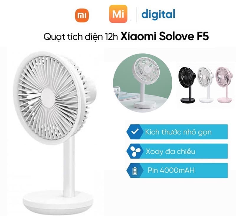 Quạt để bàn Solove F5 Xiaomi là dòng quạt để bàn, phù hợp với các anh chị em dân văn phòng. Quạt sử dụng sạc Type-C, công suất đầu ra là 5W, dung lượng pin khoảng 3900 - 4000 mAh. Nếu chỉ sử dụng quạt ở mức gió 1 thì có thể dùng liên tục được 11H còn thời gian sạc quạt là 4H. Hơn nữa, vì quạt sử dụng động cơ không chổi than nên chạy rất êm, không gây tiếng ồn trong lúc dùng.