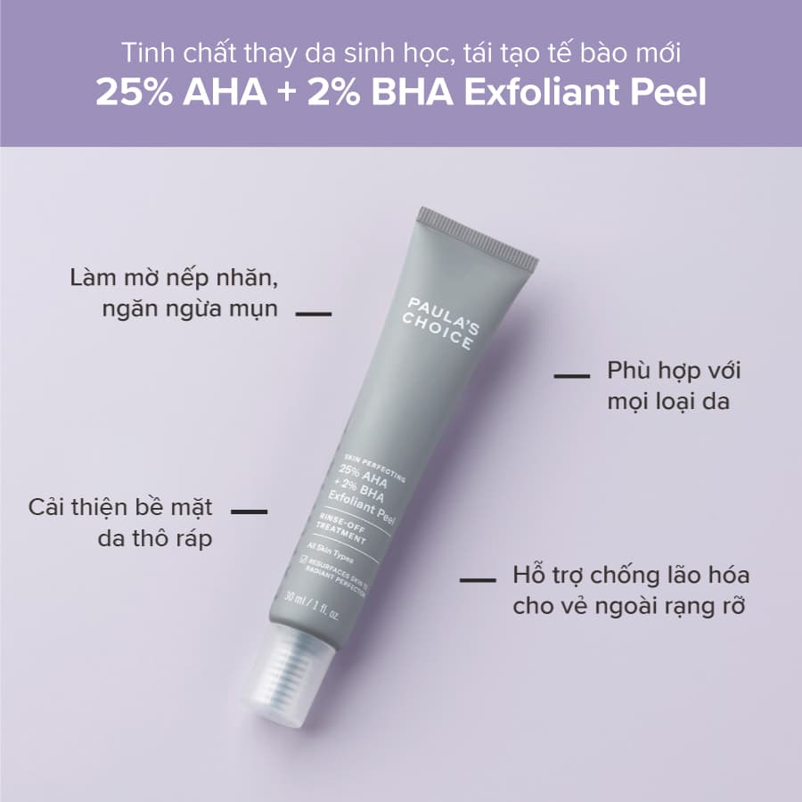 Tinh chất thay da sinh học - Peel da Paula's Choice 25% AHA + 2% BHA Exfoliant Peel. Đây là một sản phẩm giúp tái tạo làn da, cải thiện bề mặt da thô ráp, làm mờ nếp nhăn và xử lý tình trạng bít tắc lỗ chân lông. Đồng thời, nó cũng giúp làn da trở nên mịn màng, căng bóng hơn.