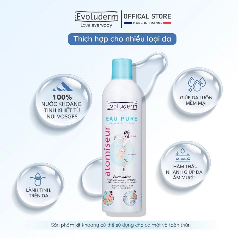 - Xịt khoáng dưỡng ẩm, làm dịu và bảo vệ da Evoluderm Atomiseur Eau Pure