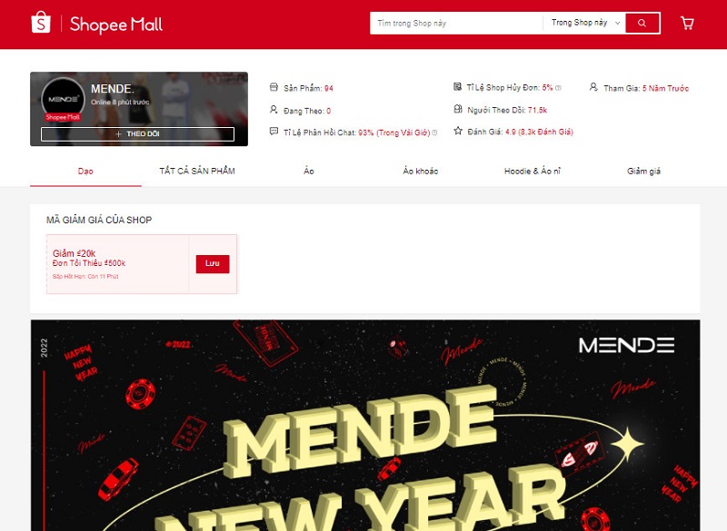 Mende là một shop bán áo hoodie nam uy tín trên Shopee, shop là một shop hoạt động lâu năm thuộc top đầu của các loại shop bán áo, cụ thể đã được hoạt động 5 năm. Tuy sản phẩm chỉ có 94 sản phẩm độc quyền của shop nhưng lại có tới 8,3 nghìn lượt mua và lượt đánh giá sản phẩm. Shop gây ấn tượng mạnh bởi có tới 4.9/5*.