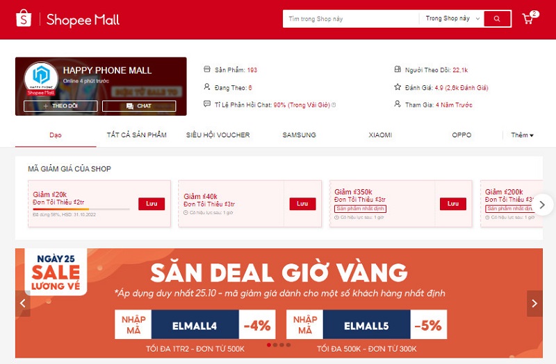 Đồng hành cũng sàn thương mại điện tử Shopee cũng được một khoảng thời gian, Happy Phone Mall luôn là địa chỉ về sản phẩm công nghệ uy tín cho mọi khách hàng. Tại shop, các sản phẩm về điện thoại, đặc biệt là dòng sản phẩm của thương hiệu Samsung rất được ưa chuộng. Shop luôn cập nhật các mẫu mã của điện thoại Samsung nhằm mang đến cho khách hàng những tốt một cách chất luo2ngj và sớm nhất. Bên cạnh đó, các voucher cùng các chương trình giảm giá theo phần trăm sẽ mang đến nhiều tiện ích cho khách hàng.