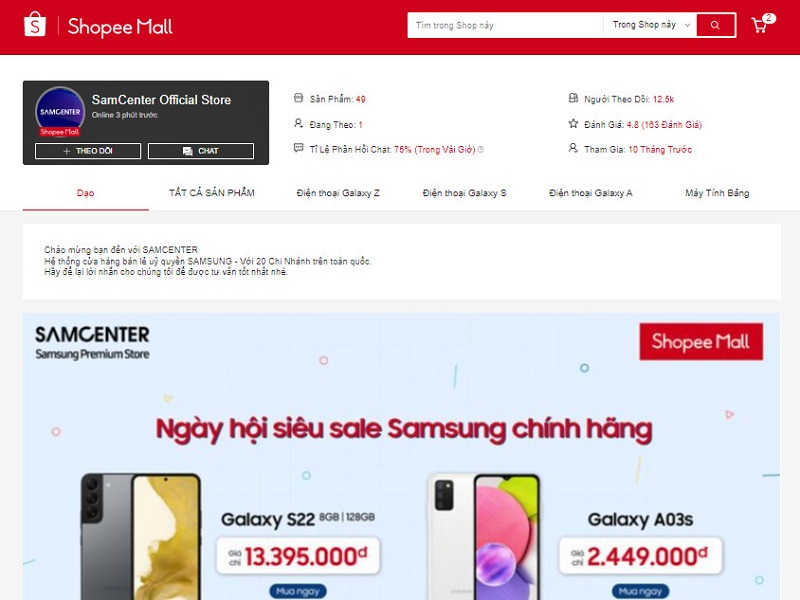 Đây là một shop chính hãng của thương hiệu Samsung trên Shopee. Điện thoại Samsung trên shop này có giá bán rất hợp lý. Hơn nữa còn có rất nhiều chương trình khuyến mãi để bạn có thể mua rẻ hơn nữa. Shop có tới hơn 65 nghìn người theo dõi, cùng với đó là 16 nghìn lượt đánh giá với mức đánh giá đạt gần như tuyệt đối. Các dịch vụ cho khách hàng cũng như chất lượng điện thoại luôn được đánh giá cao. Có thể nói đây là shop rất uy tín và làm hài lòng người tiêu dùng.