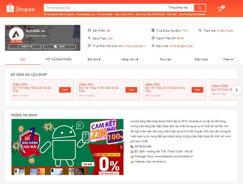 Đây là một trong những shop được khách hàng yêu thích nhất trên Shopee bởi những sản phẩm chính hãng, đảm bảo được chất lượng. Shop luôn có các chương trình giảm giá cũng như các ưu đãi nhằm tri ân khách hàng và đồng thời muốn mang lại cho khách hàng những dịch vụ tốt nhất. Ngoài các dòng điện thoại Samsung còn có các phụ kiện cũng như nhiều mẫu điện thoại khác nhau.