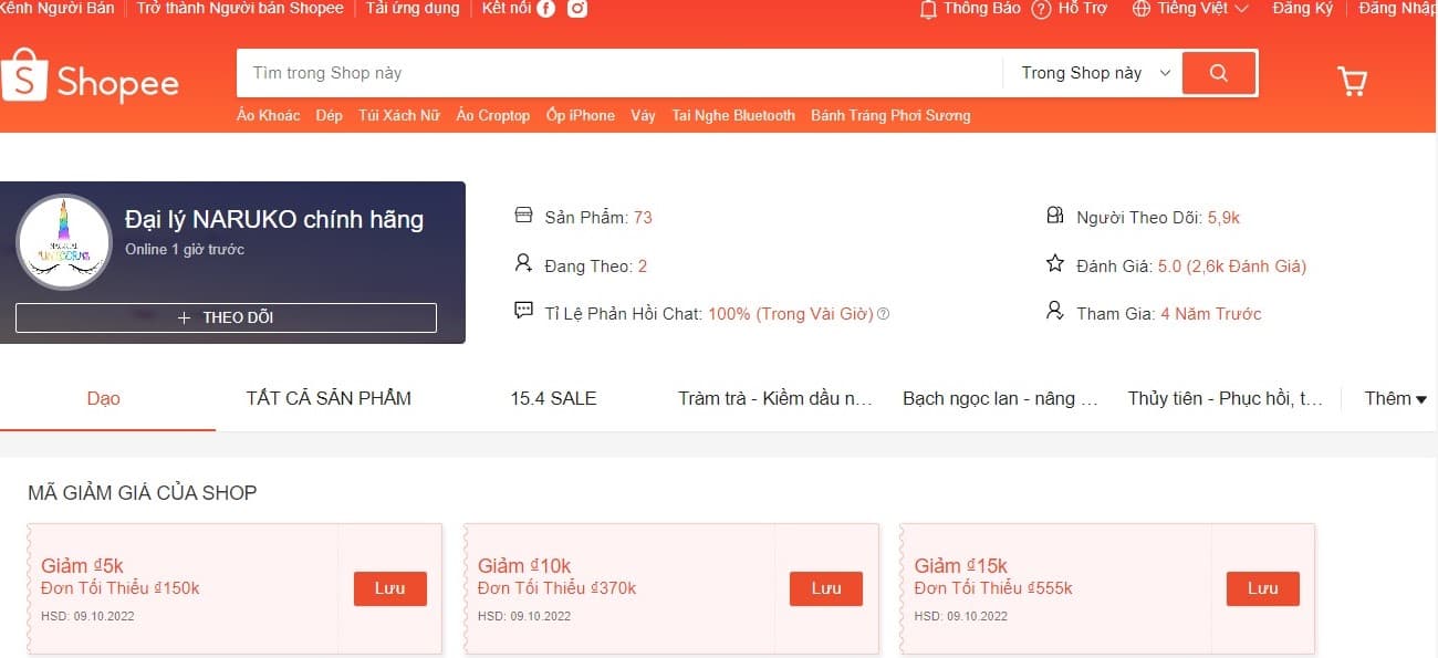 Naruko shop sở hữu 5,9 k lượt theo dõi, 2,6 k đánh giá và tỉ lệ phản hồi 100% trong vài giờ.