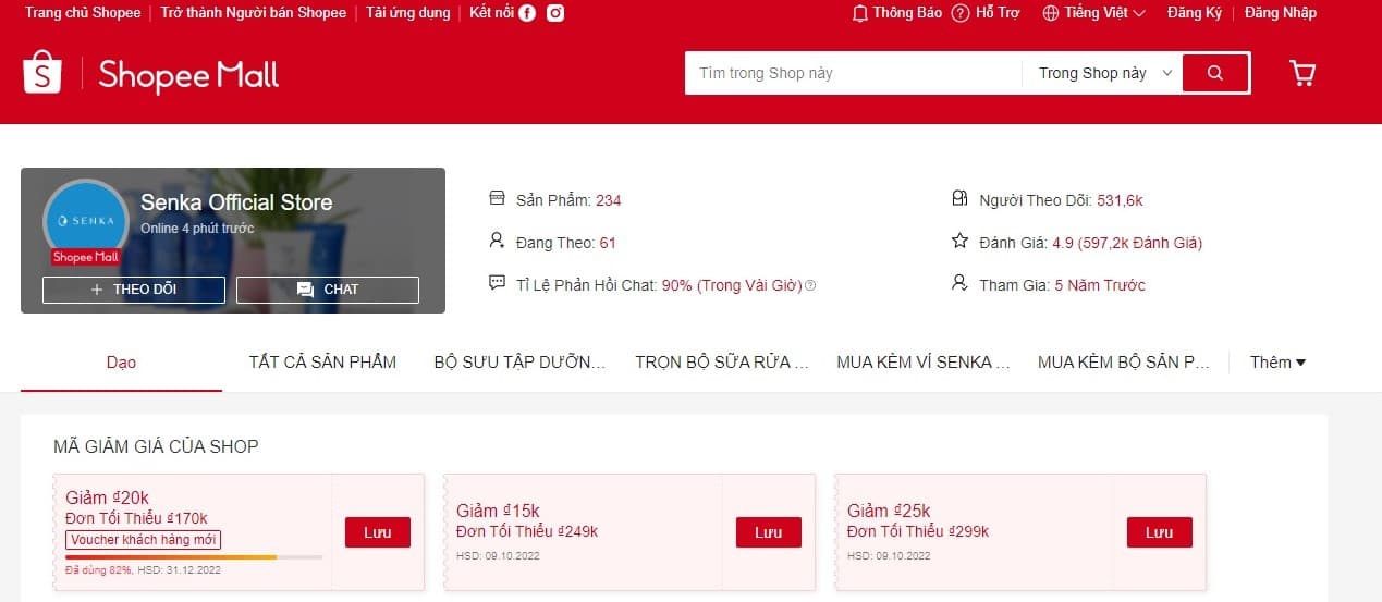 Senka Official Store trên Shopee có 234 sản phẩm, sở hữu 531,6k người theo dõi, 597.2 K đánh giá. Tham gia Shopee 5 năm trước. Senka nổi tiếng là mỹ phẩm xuất xứ Nhật Bản nổi tiếng, được khách hàng yêu thích lựa chọn.