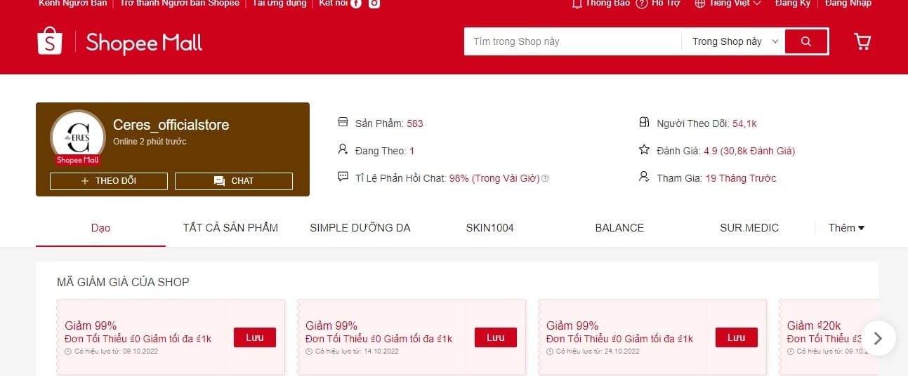 Ceres Shop sở hữu 54,1 K người theo dõi, 30,8 k đánh giá và tham gia Shopee 19 tháng trước.