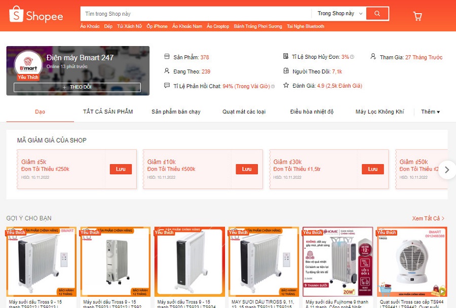 Điện máy Bmart là một trong những đại lý phân phối máy sưởi dầu chính hãng. Các sản phẩm từ điện máy cho đến hàng gia dụng được shop cập nhật nhanh chóng cùng với nhiều mẫu mã vô cùng đa dạng. Shop hiện tại giới thiệu hơn 300 sản phẩm. Các sản phẩm khi đến tay khách hàng đều nhận được các lượt đánh giá tuyệt đối. Dù chỉ ra mắt trên Shopee chưa đầy 3 năm nhưng shop đã chiếm được lòng tin của khách hàng về chất lượng cũng như các chương trình khuyến mãi. Shop luôn mang đến những voucher giảm giá nhằm tạo ưu đãi cho người dùng khi mua hàng.