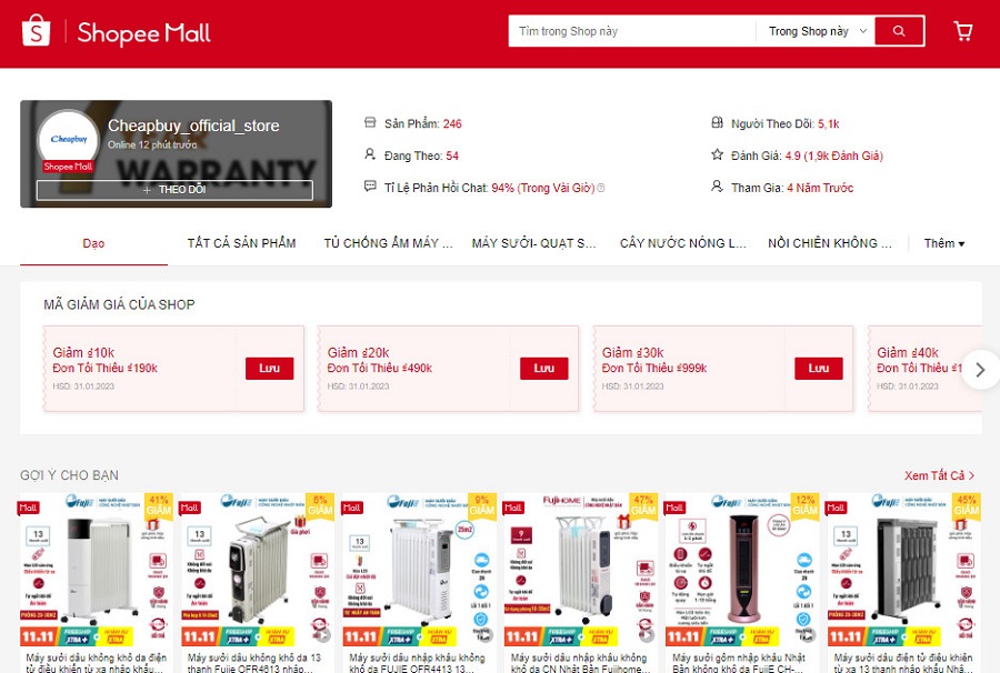 Tham gia trên Shopee Mall đã được 4 năm những Cheapbuy vẫn luôn giữ được độ “hot” của mình khi liên tục cho ra mắt khách hàng những sản phẩm vô cùng chất lượng. Hơn 5 nghìn người theo dõi shop trên nền tảng Shopee và các bài đánh giá luôn đạt được 4.9 sao cho thấy được chất lượng luôn được nâng cao hằng ngày của shop. Các sản phẩm tại shop vô cùng đa dạng, hơn 200 sản phẩm từ điện máy đến các thiết bị cho công việc. Shop luôn đề cao sự uy tín và chất lượng nên luôn được các khách hàng tin dùng.