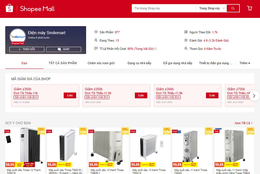 Smilemart là một trong những shop chuyên cung cấp hàng điện máy gia dụng chính hãng và uy tín trên Shopee trong đó có máy sưởi dầu. Với mức giá hợp lý như trên thị trường, các sản phẩm luôn đạt được các lượt đánh giá tuyệt đối cũng như những phản hồi tích cực đến từ khách hàng. Đồng hành với shop luôn có các chương trình khuyến mãi và các voucher giảm giá nhằm hỗ trợ cho người mua hàng. Với những gì mà shop thể hiện, thì chắc chắn đây là một trong những nơi mà khách hàng ghé mua rất nhiều.