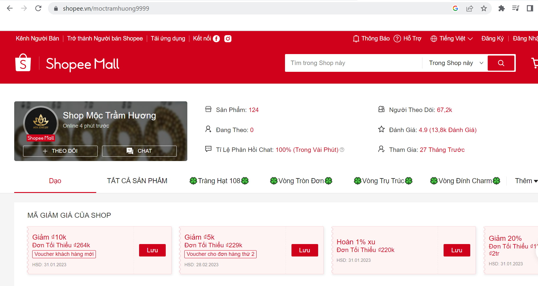 Shop Mộc trầm hương với lượt theo dõi cực khủng lên đến 67.2K và 13.8K đánh giá 4.9/5*. Đây là Shopee Mall - tức là gian hàng chính hãng được Shopee công nhận nên bạn có thể thoải mái mua hàng mà không cần lo lắng về chất lượng cũng như giá thành. Hiện, Shop đang có những mẫu vòng tay hạt trầm hương may mắn, đem lại nhiều năng lượng tích cực cho người dùng, mẫu mã đa dạng và giá cũng rất bình dân nữa đấy.