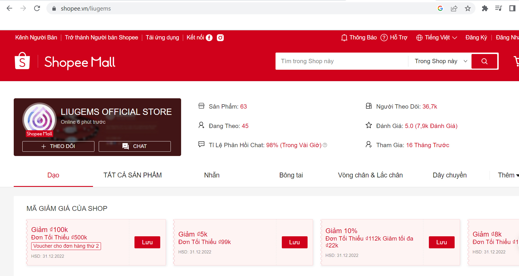Liugems Official Store cũng là một trong những Shop bán vòng tay đá phong thủy, mang lại nhiều may mắn cho mọi người. Tuy rằng mới xuất hiện chưa lâu nhưng Liugems đã xây dựng được một niềm tin cực lớn đối với khách hàng, Shop có 36.7K người theo dõi và 7.9K đánh giá 5/5*, một con số quá "kinh khủng" không phải Shop nào cũng có được. Ngoài các mẫu phụ kiện vòng tay may mắn thì Shop còn có lắc chân, dây chuyền, bông tai vô cùng đa dạng nữa nè.