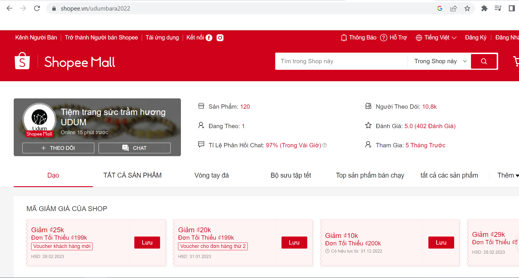 Tiệm trang sức trầm hương UDUM là Shop bán vòng tay may mắn mới ra mắt trên Shopee được khoảng 5 tháng. Dù đây là một Shop mới nhưng đã được rất nhiều khách hàng tin mua và nhận được nhiều đánh giá tốt. Shop có 10.8K lượt theo dõi, đánh giá Shop là 5/5*. Những dòng sản phẩm mà Shop bán chạy nhất trong thời gian qua có thể kể tới như vòng tay trầm hương nam nữ, vòng tay bình an tài lộc, vòng tay trầm hương hộ mệnh...