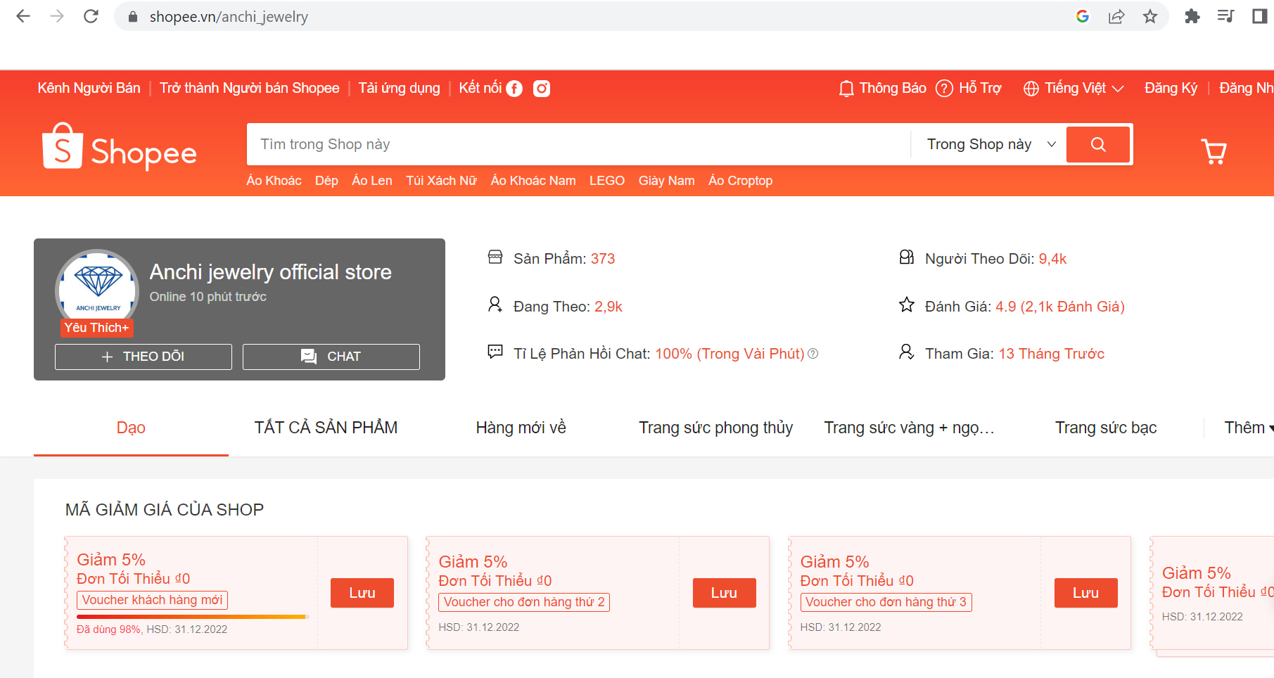 Anchi Jewelry Official Store cũng là một trong những nơi bán phụ kiện - vòng tay may mắn mọi người có thể tham khảo. Shop có 9.4K lượt theo dõi và 4.9/5* đánh giá chất lượng. Một số dòng sản phẩm nổi bật làm nên tên tuổi của Anchi Jewelry không thể không kể tới như vòng tay dây cáp đỏ, vòng tay trầm hương may mắn, vòng tay mix đá phong thủy...