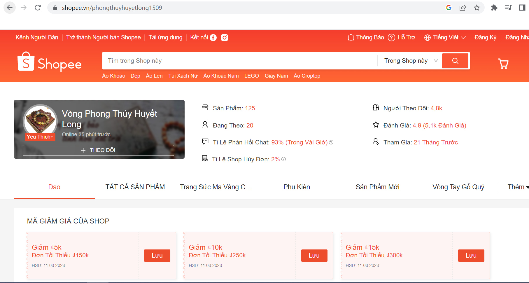 Vòng phong thủy huyết long - thương hiệu vòng tay trầm hương may mắn hàng đầu Việt Nam. Shop có 4.8K lượt theo dõi và 5.1K đánh giá 4.9/5* đến từ khách hàng. Khi mua hàng tại Shop, bạn sẽ phải ngạc nhiên trước sự đa dạng và thú vị của các loại vòng tay may mắn mà Shop đang bán. Ví dụ như vòng tay trầm hương, vòng tay gỗ trầm may mắn, vòng tay khắc con giáp...