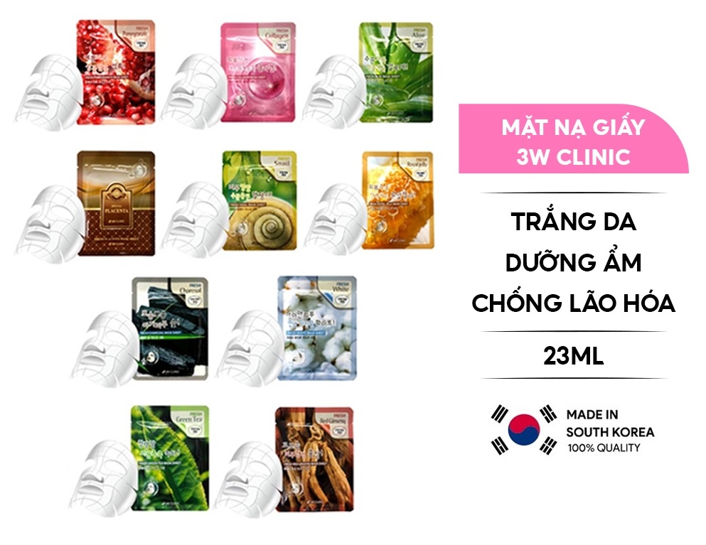 Vị trí thứ hai thuộc về mặt nạ 3W CLINIC Hàn Quốc 23ml. Đây là dòng mặt nạ giấy chứa 100% thành phần thiên nhiên như trà xanh, lô hội, nhau thai cừu, ốc sên, than hoạt tính... an toàn tuyệt đối cho da. Có tác dụng dưỡng cấp ẩm cho làn da thiếu nước, da trở nên căng mọng, mềm mịn suốt cả ngày.