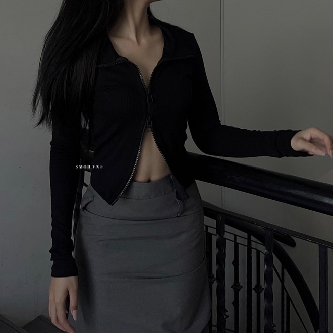 Áo thun nữ dài tay được thiết kế độc đáo với khoá kéo 2 đầu. Chiếc áo này phù hợp với những bạn theo đuổi phong cách tự do, siêu chất. Nếu bạn thích mặc áo thoải mái hơn thì có thể chọn tăng lên 1 size.