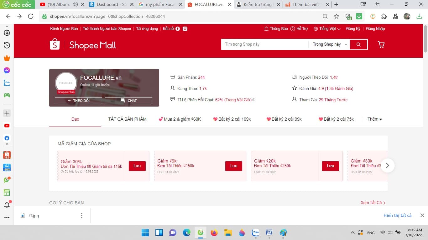 Shop sở hữu 1,4 triệu lượt người theo dõi, 4,9/4.0 đánh giá sao và tham gia 29 tháng trước. Đây là địa chỉ cho tất cả các sản phẩm mỹ phẩm Focallure chính hãng.