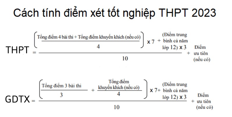 Điểm xét tốt nghiệp được tính bằng cách lấy tổng điểm của 3 bài thi chia cho 3, rồi cộng với điểm khuyến khích chia cho 4, sau đó nhân với 7. Tiếp theo, kết quả được cộng với điểm trung bình cả năm lớp 12 nhân 3. Tổng kết này sẽ được chia cho 10 và kết quả cuối cùng sẽ được cộng thêm điểm ưu tiên (nếu có).