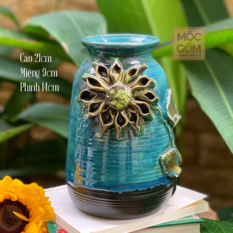 5. Bình gốm Bát Tràng men hỏa biến đắp nổi hoa hướng dương thủ công