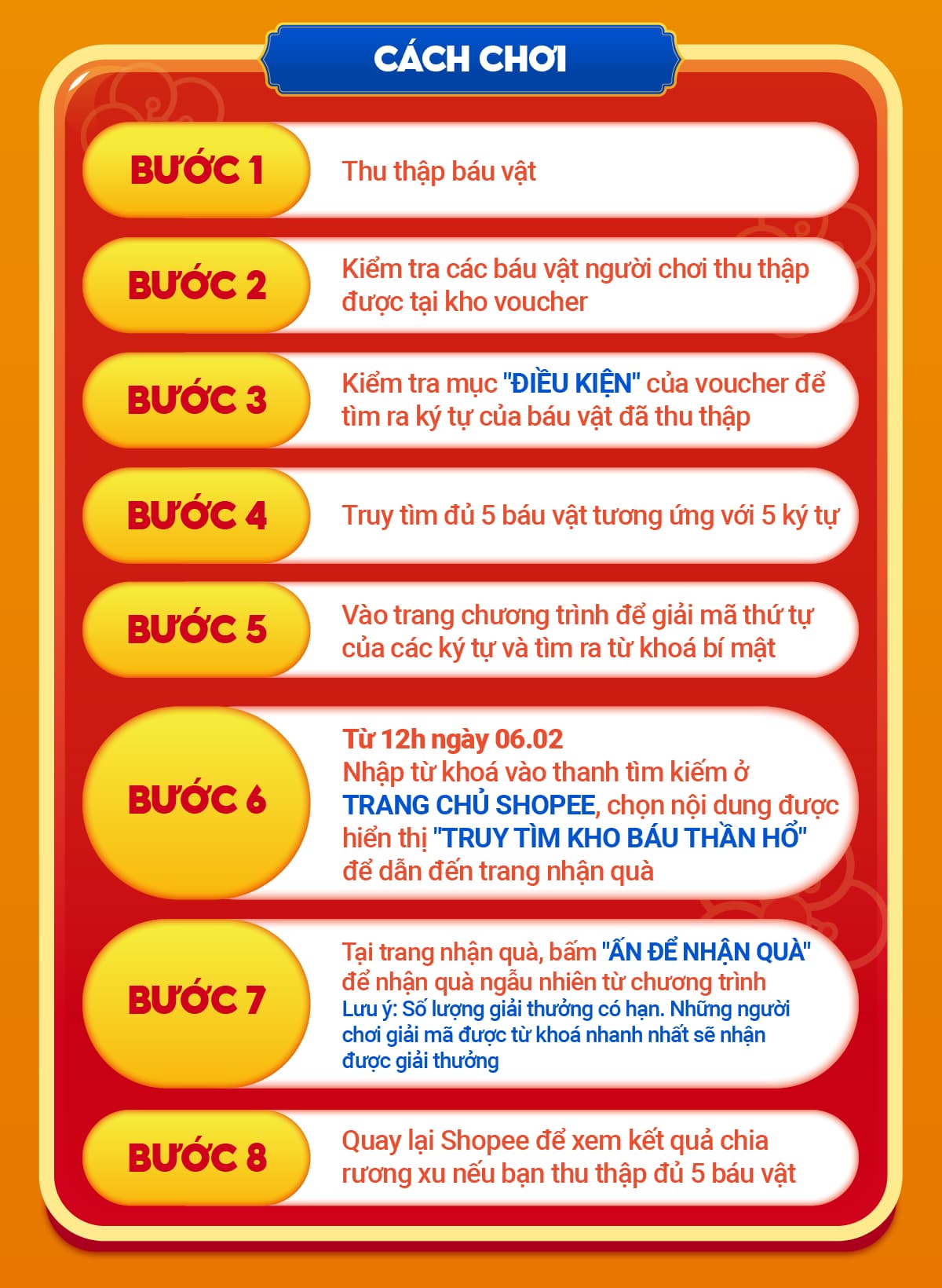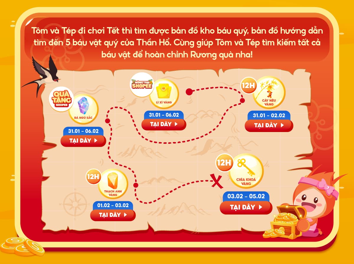 Chìa khóa vàng (Mảnh ghép hiếm): Mỗi ngày từ ngày 03.02.2022 đến 23h59 ngày 05.02.2022 duy nhất 02 khung giờ: 12H00 - 13H00 và 21H00 - 23H59 tại đường link tương ứng trên phần bản đồ và từ 0h đến 23h59 ngày 06.02.2022 tại Quà tặng Shopee
