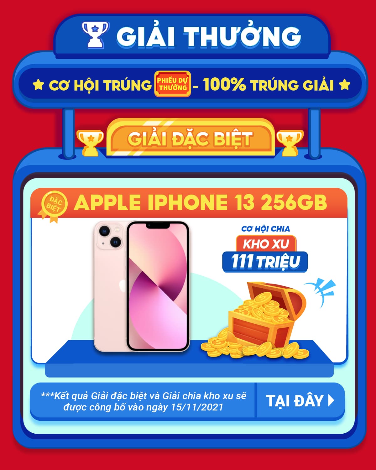 Kết quả Giải Đặc Biệt và Kho Xu sẽ đươc công bố trước 20h ngày 15/11/2021 tại trang chương trình.