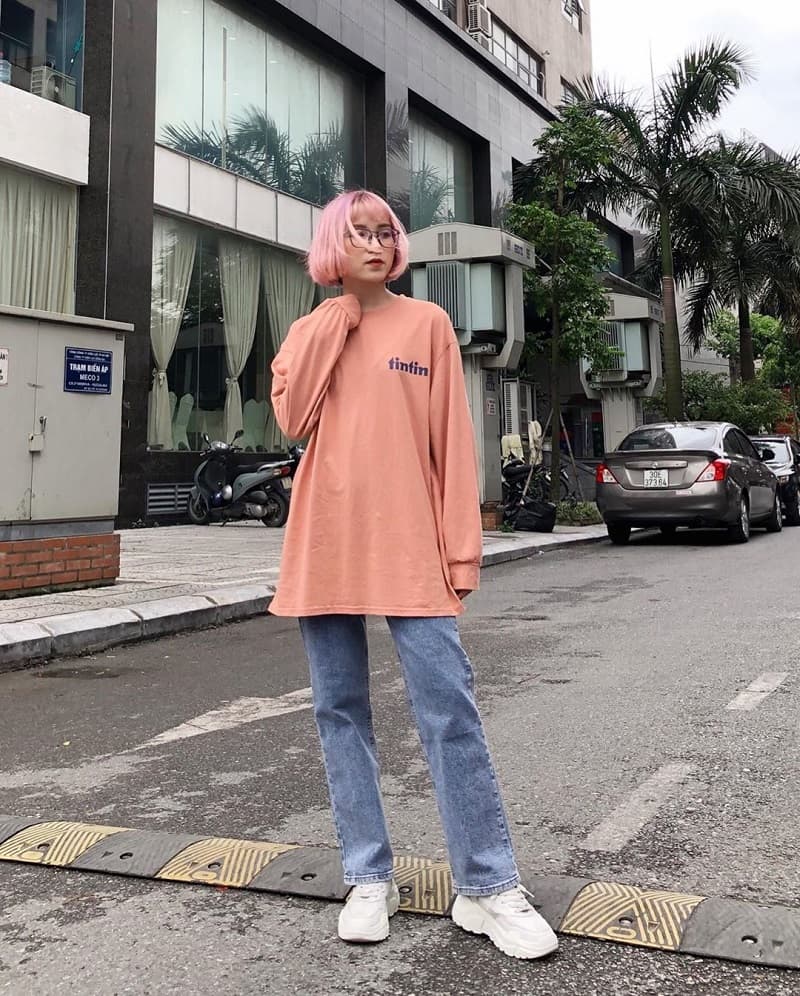 1. Áo Sweater Oversize và quần Jeans lưng cao