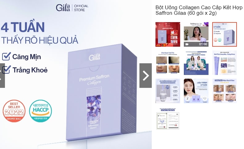 Bột uống Collagen kết hợp Saffron Gilaa (60 gói x 2g) là sản phẩm tốt, có số lượng bán khá lớn trên sàn TMĐT Shopee với 44.8k lượt. Thành phần chính của bột uống Collagen Gilaa mới, với công thức kết hợp Collagen và Saffron có tác dụng nuôi dưỡng làn da và cơ thể hoàn hảo từ sâu bên trong.