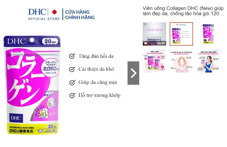 Nếu bạn chưa biết sản phẩm bổ sung Collagen dạng viên nào tốt, giá hợp lý thì DHC Collagen là cái tên đáng để bạn tin dùng. Collagen DHC bổ sung 2025mg Collagen Peptide cùng 14mg Vitamin B1 giúp cho da trở nên mềm mịn, căng bóng và trắng sáng. Cải thiện tình trạng thoái hóa khớp, tóc gãy rụng, khô xơ...