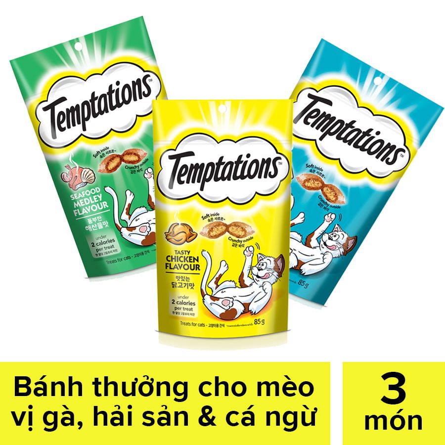 - Bánh thưởng cho mèo Temptations có 3 vị: Gà, cá ngừ và hải sản sẽ giúp thúc đẩy vị giác của mèo, làm chúng thất ngon miệng và thích ăn. Và sẽ thật tuyệt khi chơi đùa, chúng được thưởng một viên bánh thưởng ngon lành bổ dưỡng phải không các bạn.