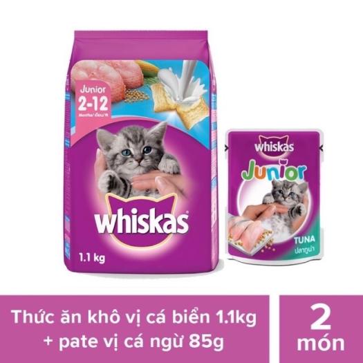 3.3. Bộ thức ăn cho mèo con WHISKAS® dạng hạt vị cá biển với sữa 1.1kg + dạng sốt vị cá ngừ 80g (6 gói)