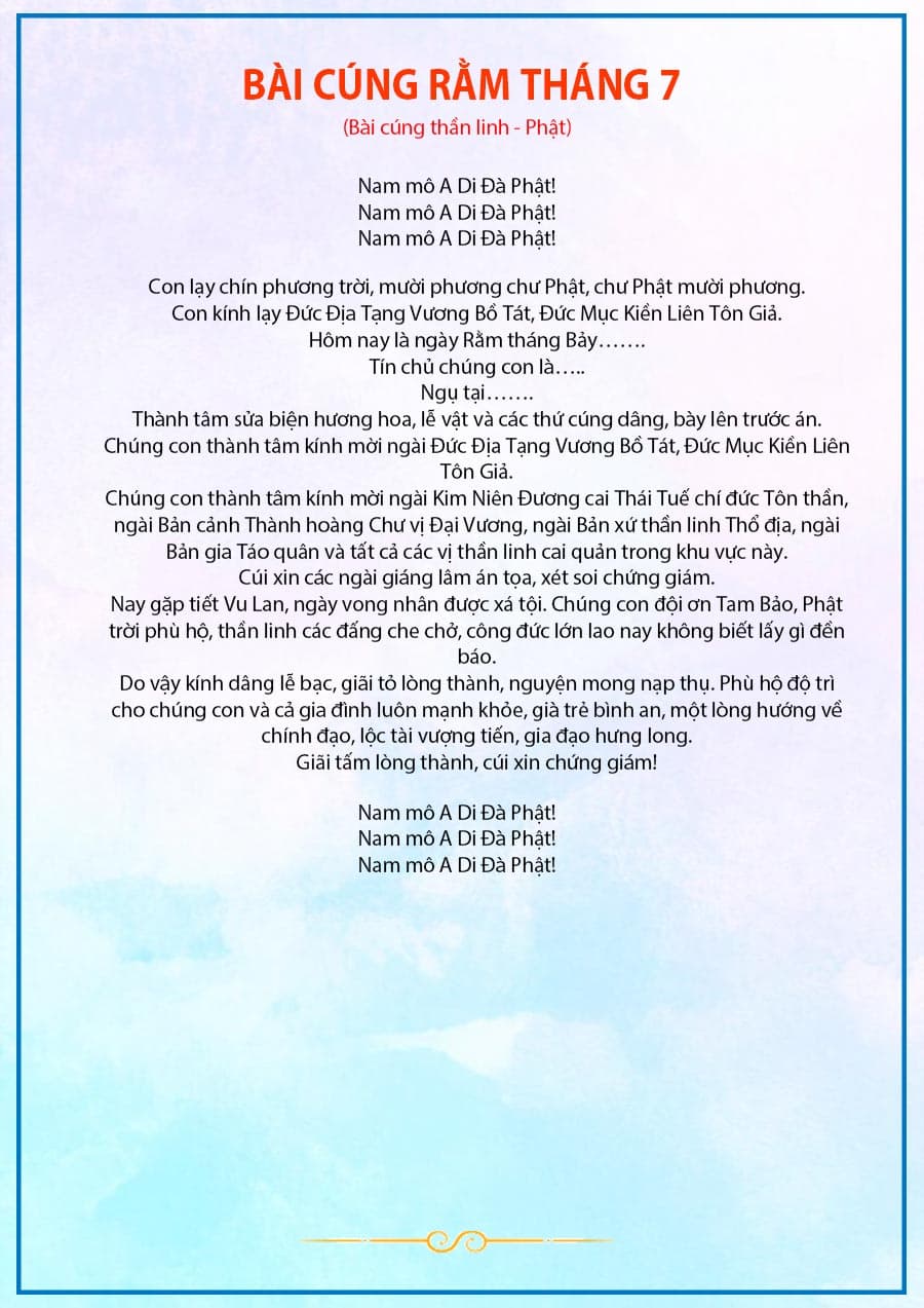 Bài văn khấn cúng rằm tháng 7 cho Thần linh, chư Phật