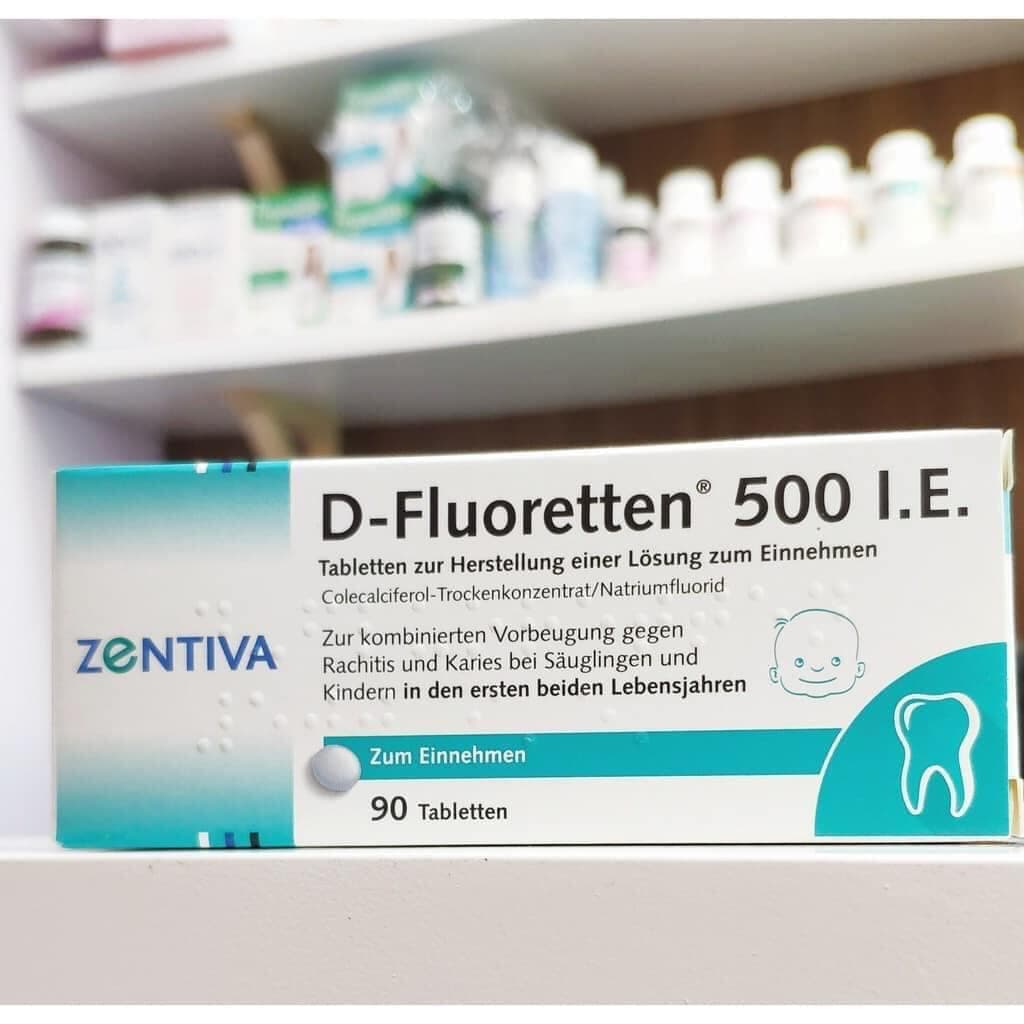 - Thành phần trong mỗi viên Vitamin D Fluoretten 500 IE; Colecalciferol 5mg Colecalciferol-Trockenkonzentrat 0,05 mg; Natriumfluorid 0,25mg Fluor Ion.