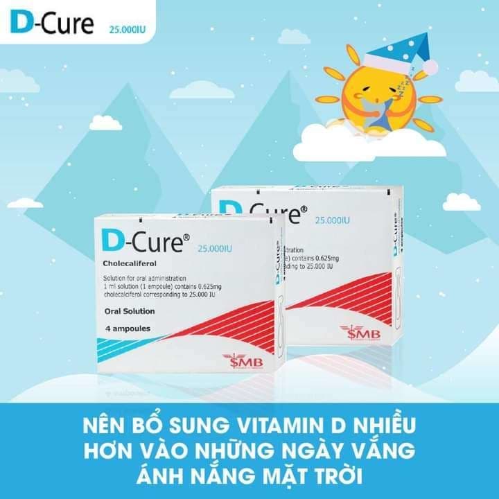 Sản phẩm viên uống Vitamin D D-cure bổ sung Vitamin D 1 hộp 4 ống với thành phần chính trong mỗi ống dung tích 1 mlD-Cure là 25.000 IU; Lượng Cholecalciferol với hàm lượng là 0,625 mg tương đương với 25.000 I.U Vitamin D3.
