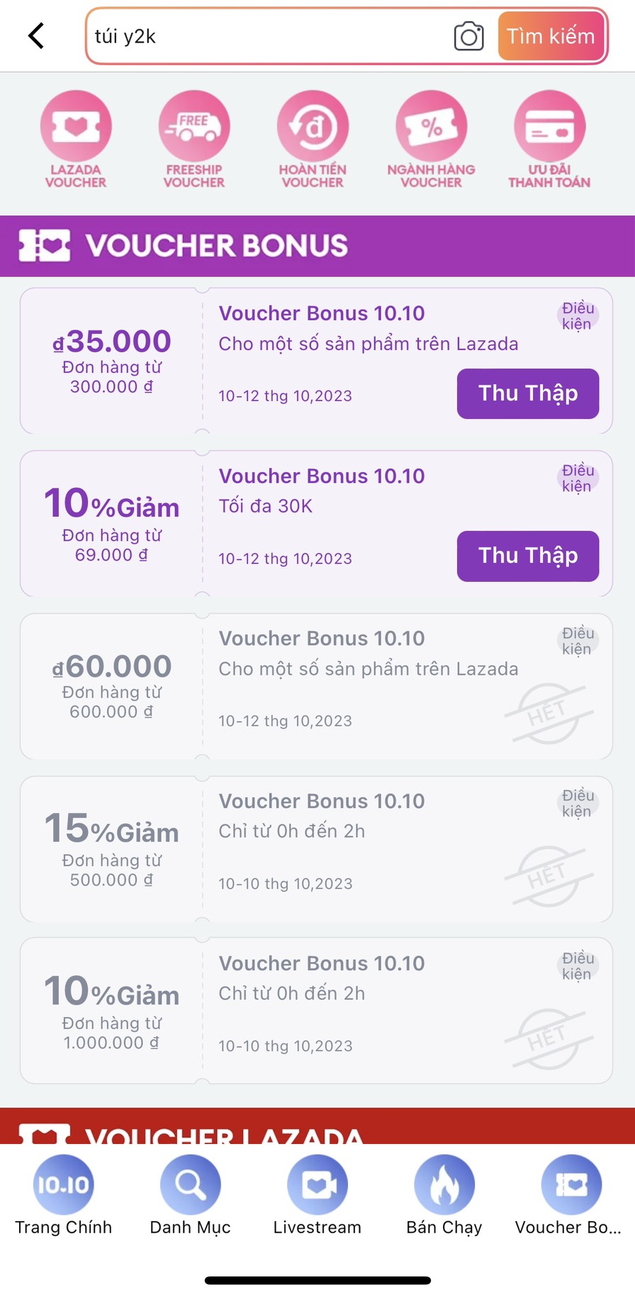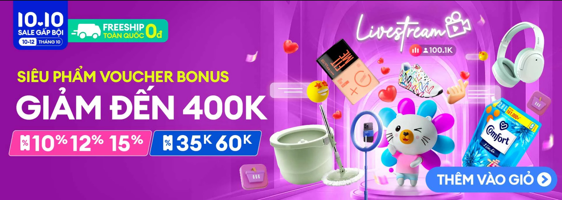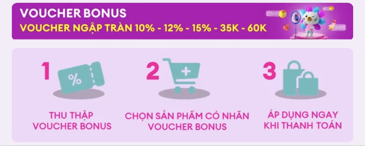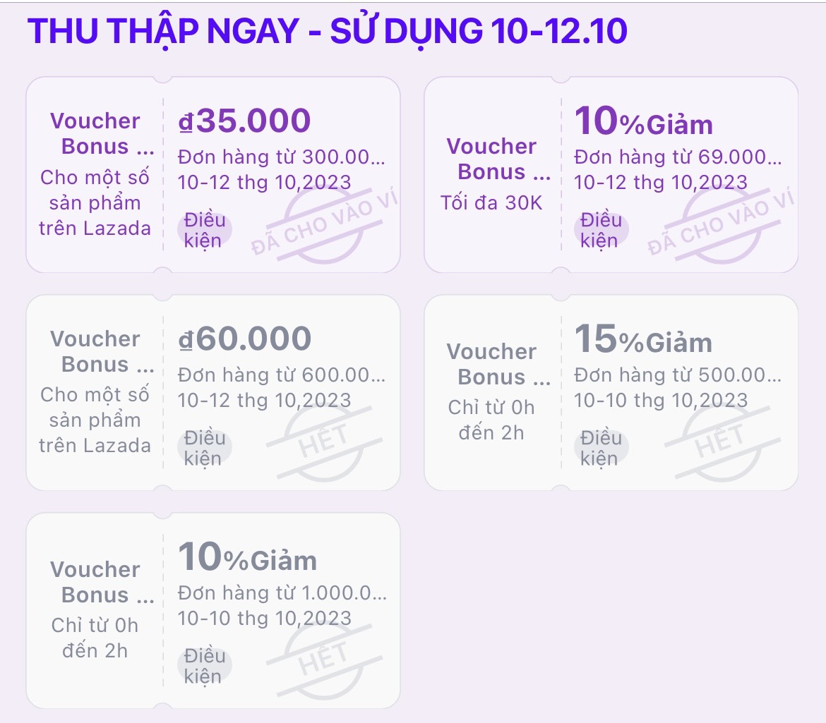 Các loại Voucher Bonus có riêng trong dịp 10.10 này gồm deal giảm 10% - 12% - 15% hoặc giảm trực tiếp 35k - 60k trên đơn. Các voucher đã mở sẵn, vô ngay Lazada để săn thôi.