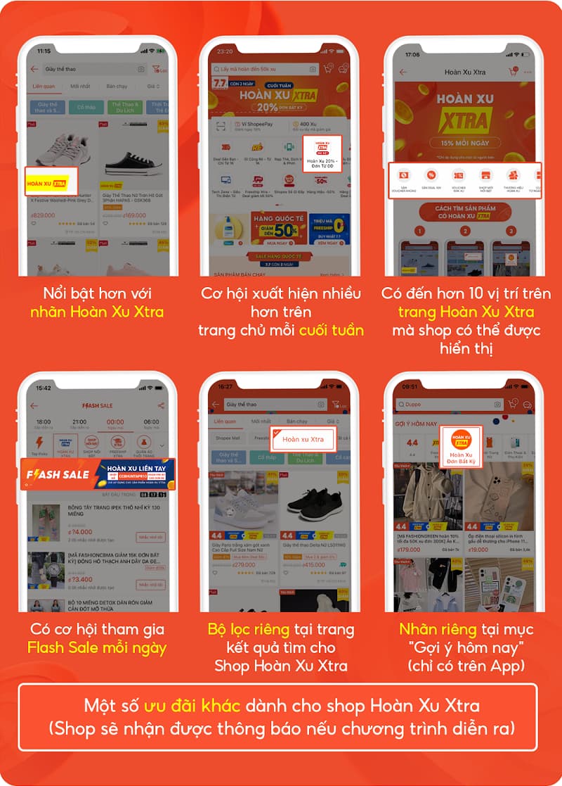 Tham gia gói Hoàn Xu Xtra các sản phẩm sẽ nổi bật hơn với nhãn Hoàn Xu Xtra, cơ hội xuất hiện của sản phẩm sẽ nhiều hơn vào mỗi cuối tuần, có cơ hội tham gia Flash Sale mỗi ngày, Shop có thể được hiển thị trên trang Hoàn Xu Xtra với hơn 10 vị trí,. Đặc biệt sẽ có nhãn riêng tại mục “Gợi ý hôm nay”.