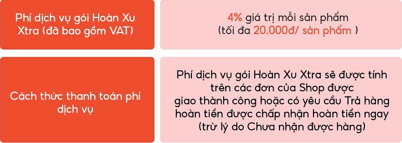 - Phí dịch vụ: Bao gồm phí dịch vụ hoàn gói Hoàn Xu Xtra là 4% giá trị mỗi sản phẩm, tối đa 20k trên một sản phẩm.