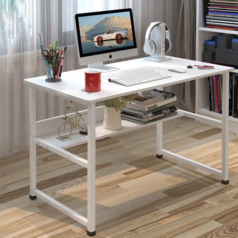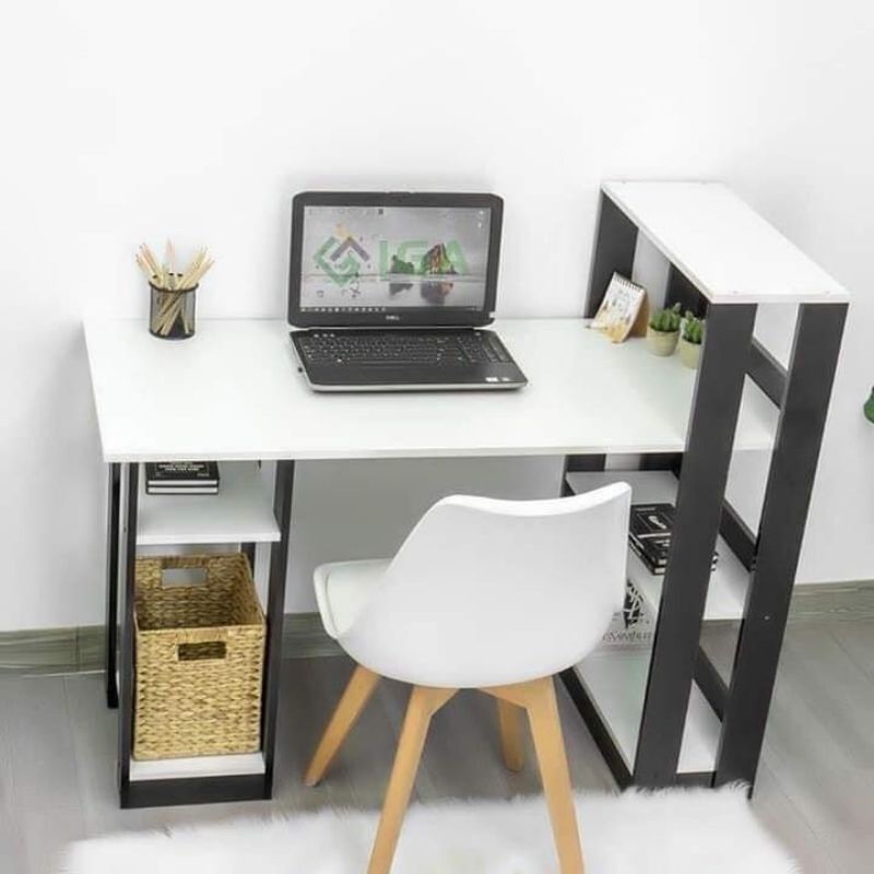 Đây là chiếc bàn làm việc hay học tập vô cùng tiện lợi vì có phần giá sách giúp tiết kiệm diện tích cho người dùng. Vì được phủ 1 lớp Melamine cao cấp nên bàn chống xước chống nước khá tốt.
