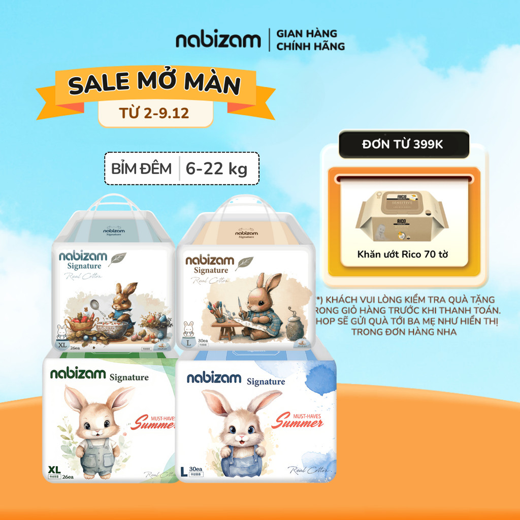 | Tã/Bỉm Đêm NABIZAM Signature Summer Đai Chun Cao Cấp, Mỏng Mềm, Siêu Thấm Hút Size Cho Bé 8-22kg | 48.51% | 414,540₫ | 94 | Mở Shopee | ||