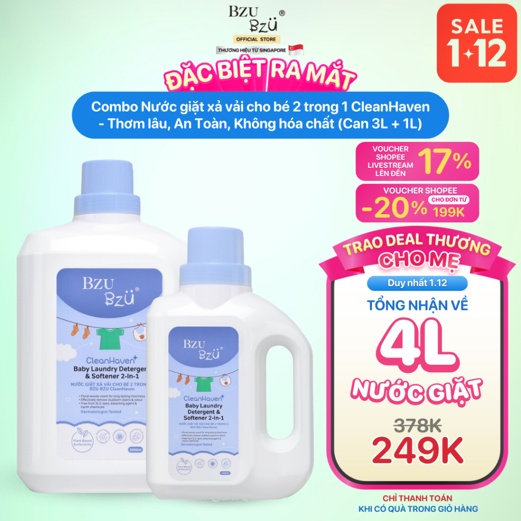 | [COMBO 4 LÍT] Nước Giặt Xả Vải BZU BZU Cho Bé Sơ Sinh Thơm Lâu - An Toàn Cho Bé 2in1 CleanHaven Can 3 Lít + 1 Lít | 63.36% | 377,999₫ | 288 | Mở Shopee | ||
