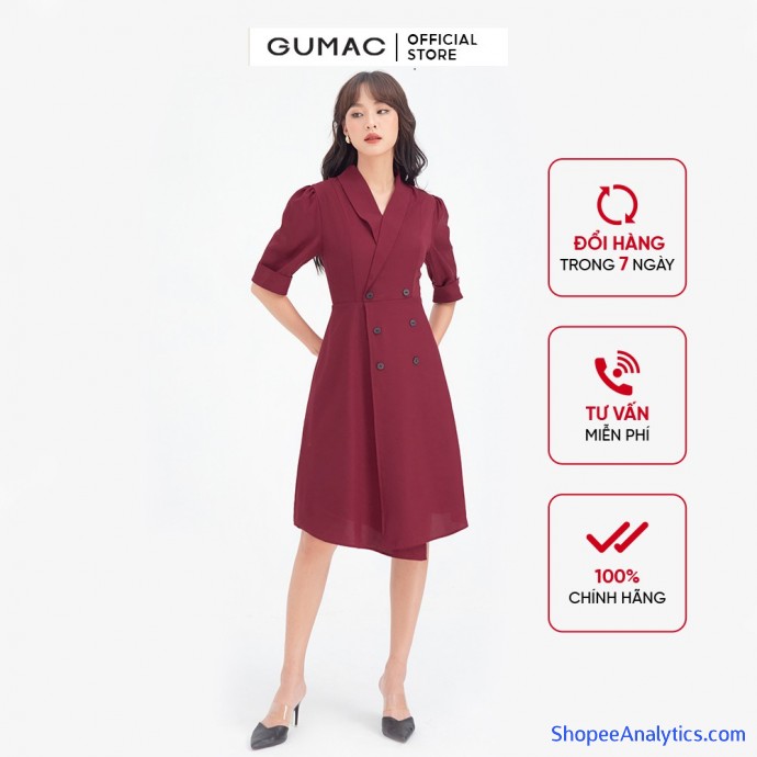 Đầm xòe nữ cổ vest đính nút GUMAC màu đỏ tay lỡ sang trọng DB698