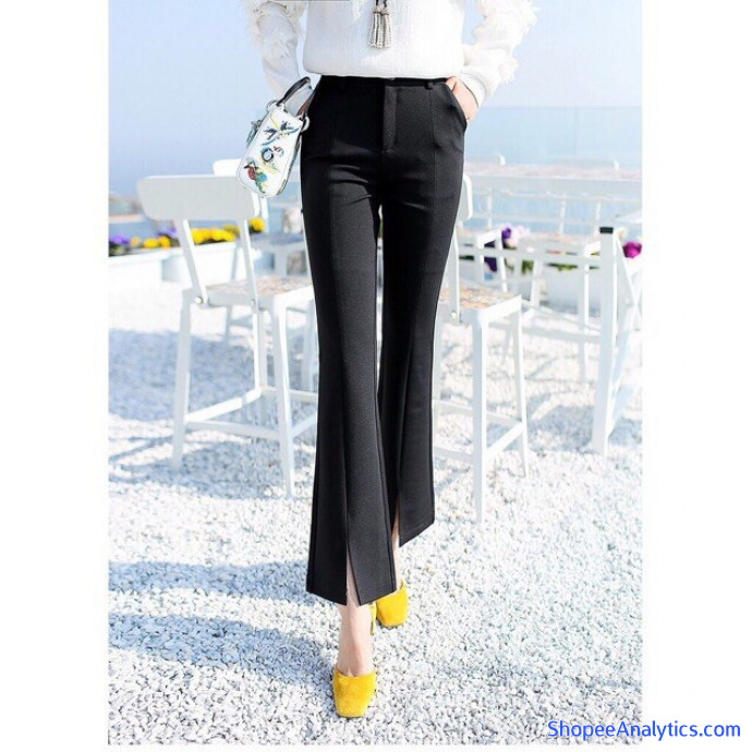 Quần với thiết kế ôm sát phần bụng và mông, phần ống loe nhẹ kết hợp cắt xẻ ly phía trước