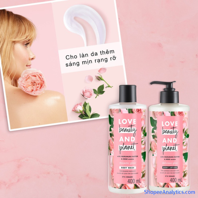 Tại Love Beauty And Planet, chúng tôi cam kết thực hiện những hành động nhỏ bày tỏ yêu thương dành cho trái đất và cùng chung tay giúp hành tinh của chúng ta ngày càng xinh đẹp hơn. Mục tiêu của chúng tôi chính là làm giảm thiểu đến mức tối đa dấu chân carbon cho đến khi chúng gần như bị xóa sổ khỏi hành tinh tươi đẹp này. Chúng tôi đã bắt đầu hành trình tuyệt vời này bằng những thành phần và nguyên vật liệu tốt nhất cho sản phẩm của mình. Mỗi một vỏ chai của Love Beauty And Planet đều được làm từ nguyên liệu 100% tái chế được. Tuy các nắp chai vẫn chưa được làm từ nguyên liệu có thể dùng để tái chế, nhưng chúng tôi vẫn đang nỗ lực hết mình để làm nên điều đó. Sữa tắm & Sữa dưỡng thể Love Beauty And Planet Majestic Glow cùng tinh chất bơ murumuru giúp dưỡng ẩm và mang lại cho bạn làn da căng bóng, sáng mịn đầy rạng rỡ. Công thức hòa quyện cùng hương thơm từ hoa hồng Bulgari quyến rũ đầy lãng mạn mang lại cho bạn cảm giác như vừa bước ra từ vườn hoa.