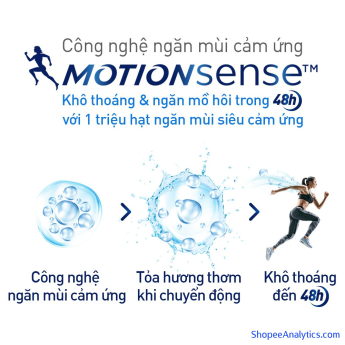 - Công nghệ MotionSense với 1 triệu hạt ngăn mùi siêu cảm ứng tự bung tỏa khi vận động, giúp ngăn mùi và mồ hôi suốt 48 giờ