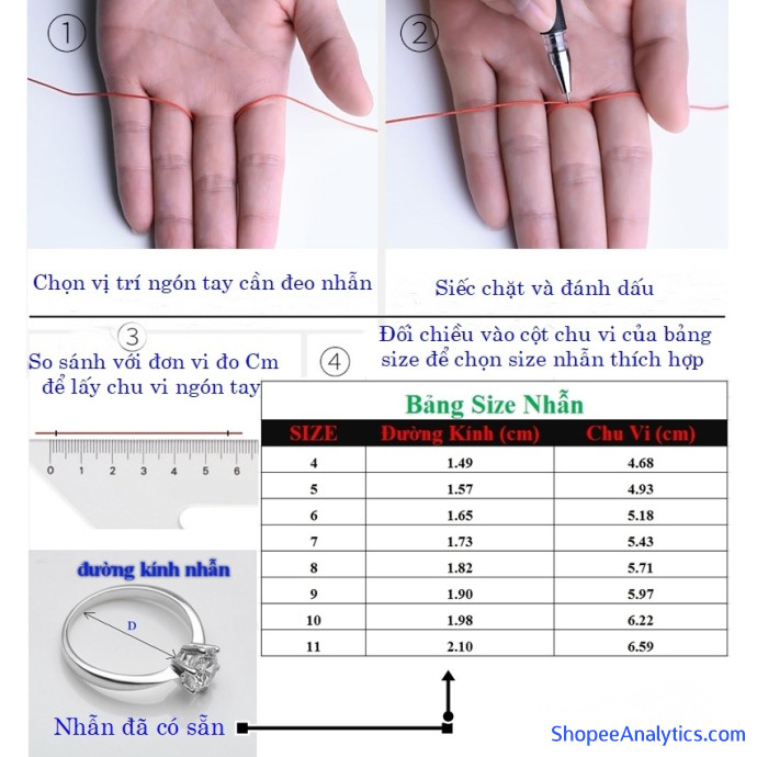 Size #7: chu vi Khoãng 5.4 cm; đường kính nhẫn 1.73 cm